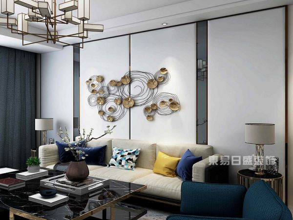 新中式风格是与时俱进的产物,复古又兼具时尚,将中式元素巧妙的融合入现代设计,为现代家具生活注入新的传统气息。客厅整体空间在家具的细节上运用黄铜亮丽点缀,精致时尚,复古的插花瓷器摆件,沙发背景墙中式特有的直线条装饰,复古宫灯造型,简洁雅正。