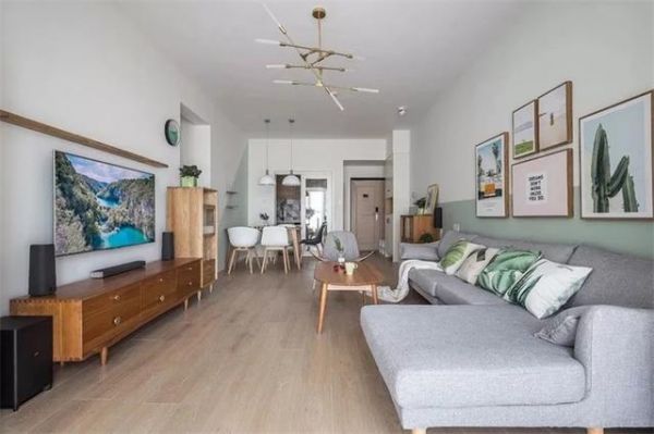 沙发背景墙是做了拼色墙的设计,淡绿色和白色的结合也让人感觉很舒适。再加上北欧风的布艺沙发、挂画和茶几等,显得轻松而又惬意。