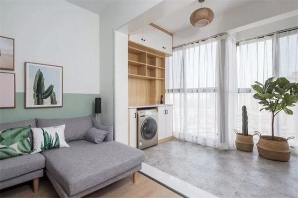 阳台位于客厅的边上,两者之间不加隔断,让空间更加通透明亮。在阳台一侧做上洗衣机、洗手台和吊柜的组合式设计,满足屋主的日常使用需求。