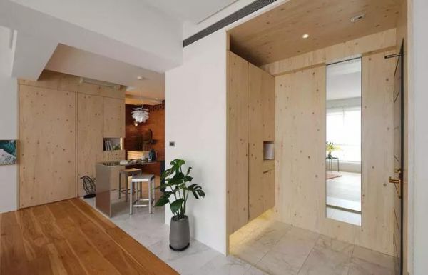 入户玄关被木质的造型所包围,相同质感的木饰面板、吊顶和柜子,还搭配穿衣镜,让玄关看起来更加舒适。鞋柜的底部留空加上藏光,使用起来也更方便。