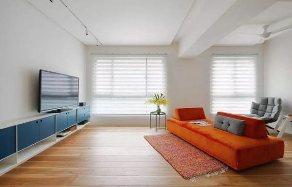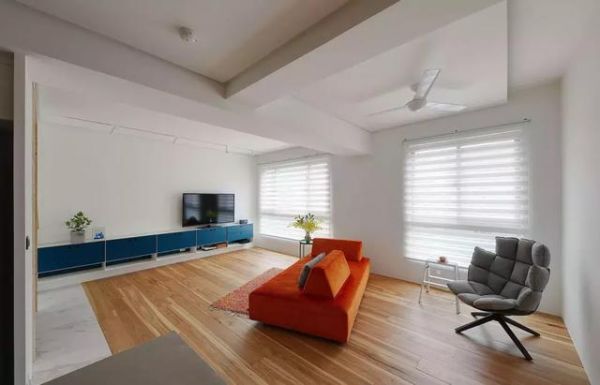 玄关边上的就是客厅空间,舍弃了茶几之后让客厅看起来更宽敞。横厅格局的客厅选择了沙发不靠墙的设计,悬空的电视柜看起来也更简洁。