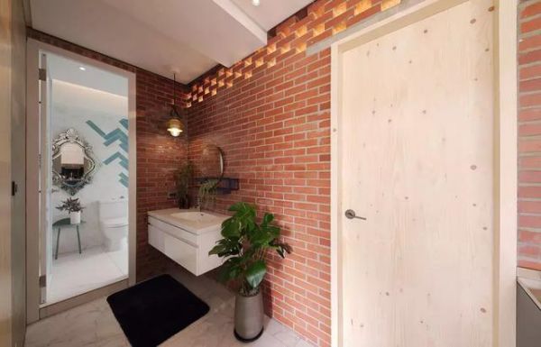 卫生间的洗手台是放在了门外,延续了厨房处的红砖墙设计,上方的造型当中还加入了藏光,看起来真的很有格调感。