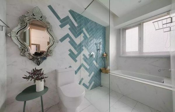 卫生间的空间是非常宽敞的,大理石的墙地砖搭配这种创意的彩色长条砖,淋浴区内有着淋浴和浴缸,可以满足屋主一家人不同的使用需求。