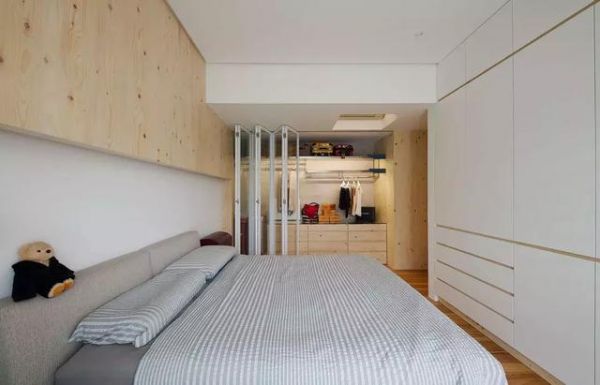 在卧室的了另一侧用玻璃折叠门隔出了一个衣帽间空间,还在衣帽间内加上了藏光,看起来更加时尚,折叠门也方便平时拿取衣服。