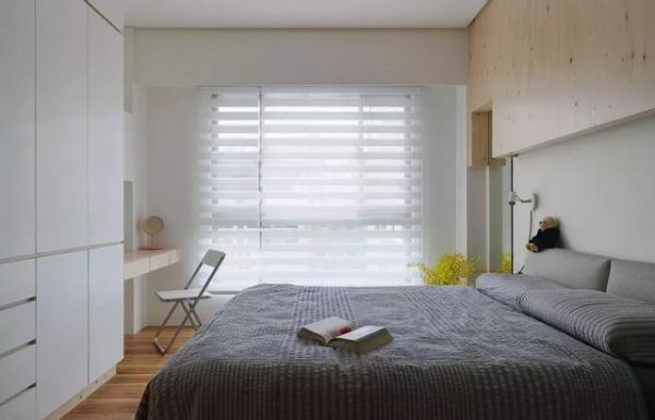 卧室内部的设计以简约风为主,床头背景墙加上了木饰面板的设计,让卧室层次更为分明、床尾的衣柜中留出书桌、梳妆台的位置,使用更加方便。