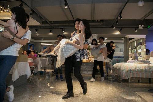 七夕节,上海南丰城发生了一幕壮观而惊人的公主抱赛跑。一群男子抱着、举着自己的爱人穿过商场的各个走道,风一样地冲进罗莱家纺专营店内,这速度比百米冲刺还快。