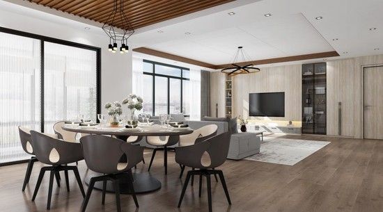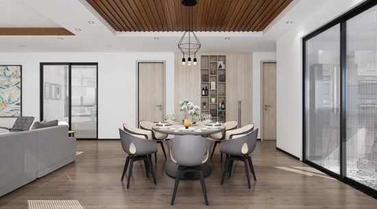 生活要有仪式感,一餐一饭也要精致、细腻。餐区空间,圆形餐桌设计搭配线条明朗的餐椅,嵌入式餐边柜贴合墙面,柜体两边酒格对称设计,家人围坐一堂享受美食盛宴,凝聚欢声笑语,促进感情升温。极简的吊灯装饰将简约之美彰显无疑,尽显生活质感。
