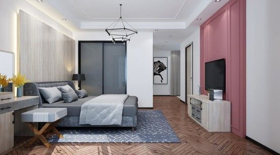 古典蓝的软包床与同色系地毯奠定主卧空间高贵优雅的调性。简约木纹床头护墙板搭配灯带形成空间亮点,与梳妆台、电视柜板面呼应,整体空间调性统一,质感满满。衣帽间和休息区一墙之隔,并且非常巧妙地将墙体利用起来做柜体,时尚又便利。极简的艺术灯饰用轻描的线条,给卧室带来轻盈感,整体没有过多的花哨和多余的软装,却把空间的美感和实用功能发挥到了极致。