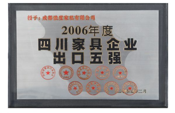 其实,早在2006年就已获得由四川省经济委员会、四川省家具行业商会、中国质量认证中心成都分中心、中国国际贸易促进委员会四川省分会等单位联合授予的“四川家具企业出口五强”荣誉称号。“让振兴中国家具工业,让中国家具享誉世界”一直是浪度家居坚守的使命。