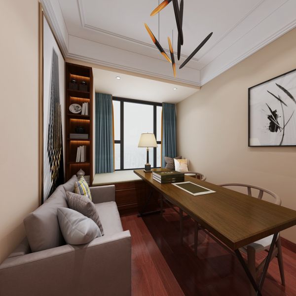 男女主平常会在书房办公及休闲,设计师考虑到该空间的双功用,特意在室内增设了沙发,休闲沙发又不至于让书房太过沉重死板,搭配泼墨挂画舒缓空间气氛,让书房变得安静温和起来。