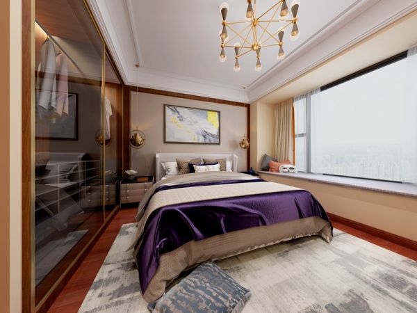 设计师在主卧里用金属材质在细节上的描边、点缀等造型,含蓄地表达出家主理想中内敛而不失格调的华丽感。主卧有一个单独的观景阳台,它与通透式的衣柜造型搭配,完美地诠释了大宅应有的气质。