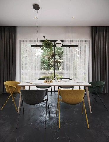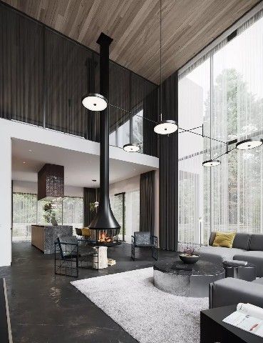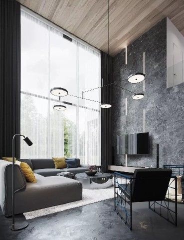 挑高的客厅设计,多面超大落地窗,让一层空间通透亮堂,木质吊顶搭配简约工业风黑色组合吊灯,给空间增添了一份宁静和质感。