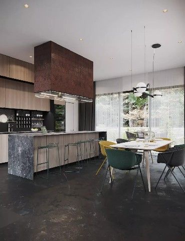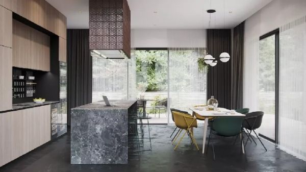 与客厅相连的是开放式的餐厨空间,岛台作为厨房和餐厅的分隔区,充当了隔断和玄关的作用,将空间划分开来。岛台不仅有隔断的作用,也承担了厨房和餐厅的部分功能。