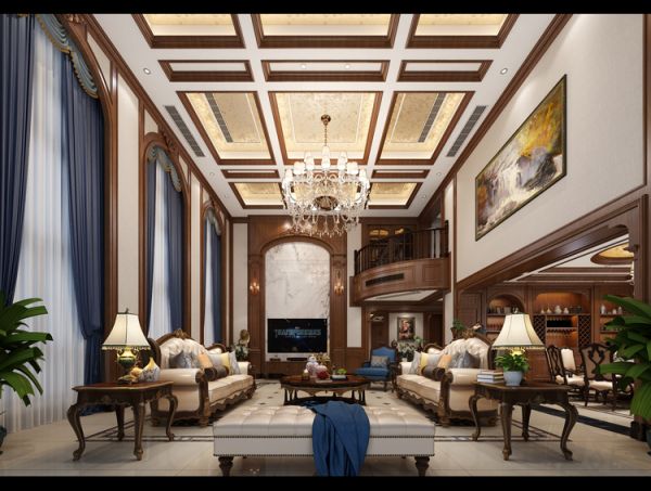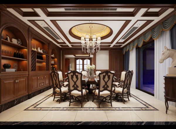 本案做为美式风格的其中一种,伴随着浓郁的复古情怀和主人生活的人文气息。一楼公共部分及主卧室色彩主调为深咖啡色,家具搭配经典的皮质沙发,实木家具等。