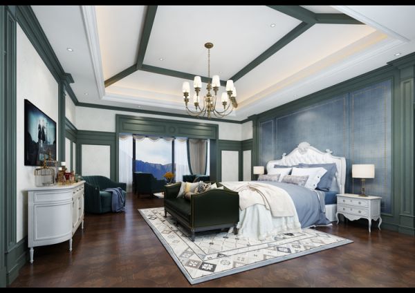 两个小孩房色彩相对丰富、时尚但并不过分张扬,室内各种花饰、摆件、丰富的木线变化、优雅明快的窗帘帷幄是西式传统室内装饰,空间环境表现出华美、富丽、浪漫、神秘的气氛。