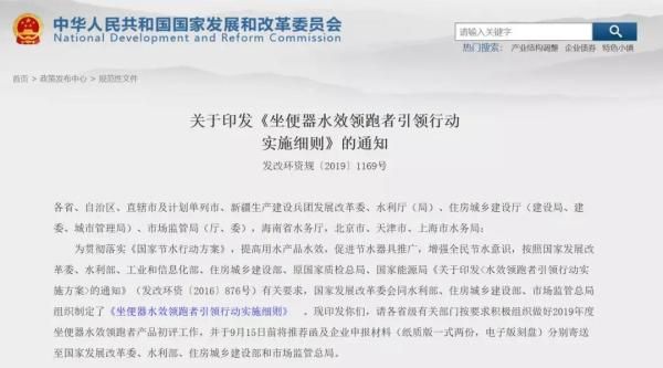 在《坐便器水效标识实施规则》实施一年之际,领跑者产品初评工作也陆续开展。2019年7月3日,国家发展改革委、水利部、住房城乡建设部、市场监管总局联合印发《坐便器水效领跑者引领行动实施细则》(以下简称“实施细则”),要求各省级有关部门按要求做好2019年度坐便器水效领跑者产品初评工作。