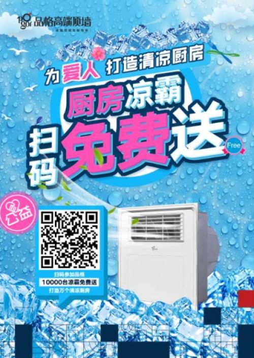 本次活动,品格将一万台品格凉霸无偿投放到全国各地的经销商门店,无论是新房装修还是老房翻新的用户,只需要扫描品格官方活动二维码参与活动并有机会免费领取品格凉霸一台,亲手为爱的人,打造一个清凉厨房!