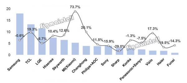 备注:上图为2019年上半年全球电视分品牌出货数量及同比走势情况(单位:百万台, %),资料来源于群智咨询(Sigmaintell)。