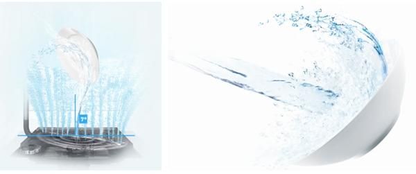 当上下两层喷淋臂快速旋转的时候,密集的水柱就在舱体内进行360°全方位高压喷射,保证让无论放置在哪个位置的碗碟和不同深浅口径的餐具,都能清洁到位,不留死角。