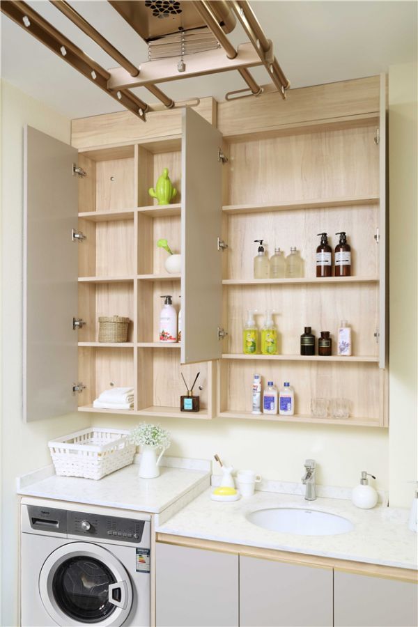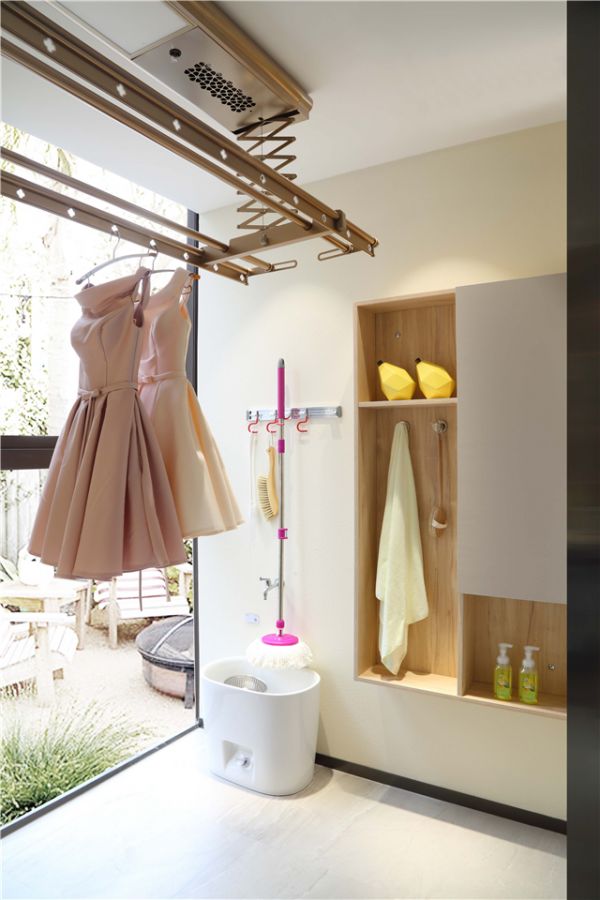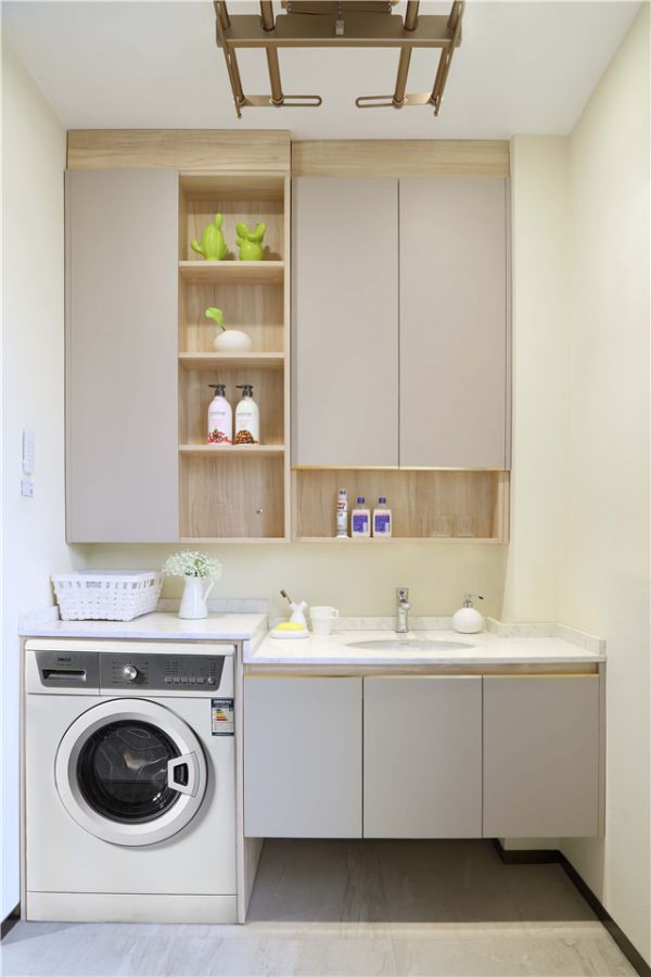 阳台右侧的便利式拖把架、踩踏式洗把盆,使原本杂乱、易滋生细菌的拖把堆有了容身之所!开放式、单开门式柜体的运用更是使阳台空间收纳倍增!