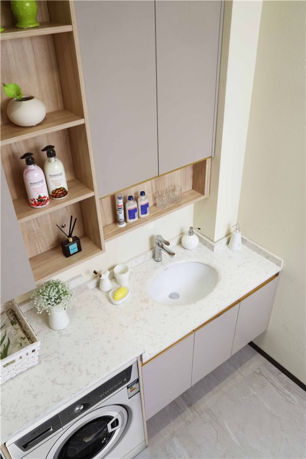 空间中洗漱、置物、洗衣功能齐全,不仅收纳布局新颖,还最大化合理利用空间。在匆忙的清晨,免去排队洗漱的烦恼,极大的提升效率,在一天的最开始开启高效生活!