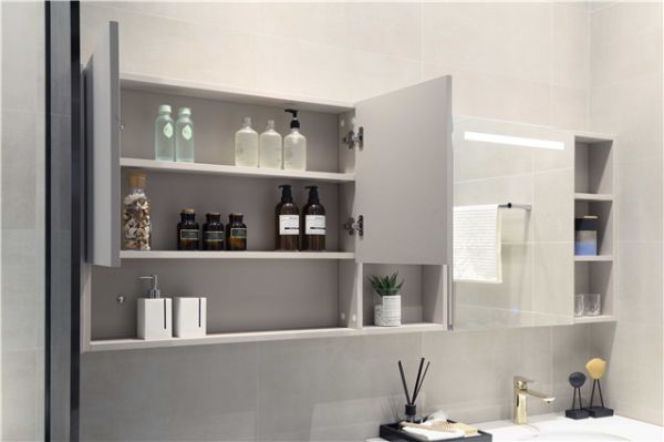 在浴室空间不断注入更人性化的设计与人文关怀。超大镜柜,储物摆放超随心。在灰色调与灯光的映衬下,给人柔和的触感,门板加入金属色装饰点缀、增添一丝情调,整个空间显得静谧而美好。