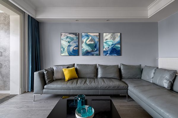 烟灰色的墙面让整个客厅显得格外沉静优雅,使用纯黑色的茶几与深色调的烟灰色沙发,简练的石膏线,让整个空间呈现出低调、优雅的成熟气质。汇明A+墙布织锦装饰画《云间舞》通过变换的色彩与流畅的曲线,一下子点亮客厅氛围。《云间舞》承袭新中式的雅致意蕴,融合现代的时尚动感,巧妙地为客厅注入一丝典雅气息。