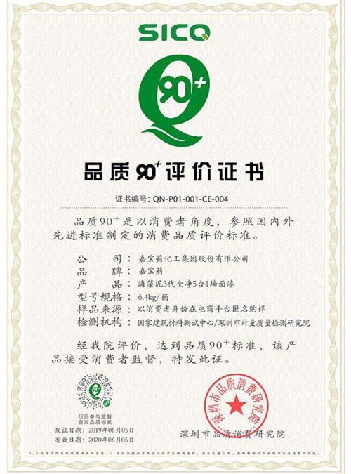 “SICQ品质90⁺标准”宏观上指安全、主要指标达到以欧盟为主的国际一流品质标准要求。华为技术、海尔集团、小米科技等国内知名品牌的明星产品都获得了“品质90⁺”的认证。嘉宝莉海藻泥3代被评为首个获得“SICQ品质90⁺标准”的涂料产品,代表着嘉宝莉一直坚守品质,以90分以上的品质标准为消费者带来最好的产品体验。
