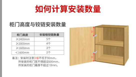 确定了选购哪种类型的铰链,第二步便是数量问题啦!适中的铰链数量可以延长柜门的使用寿命和使用的流畅性,参照下表标准,让你不多买也不买漏。