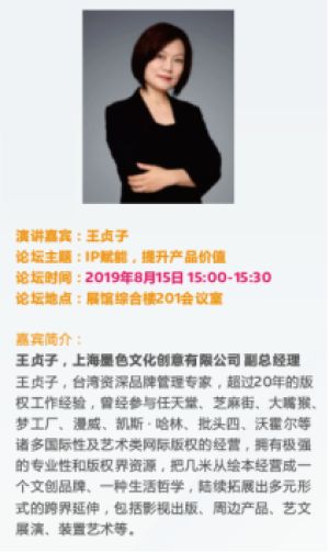 把几米从绘本经营成一个文创品牌、一种生活哲学,并陆续拓展出多元形式的跨界延伸的上海墨色文化副总经理王贞子女士相信大家并不陌生,本次论坛她将进行主题为“IP赋能,提升产品价值”的演讲,带领听众了解IP赋能产品的巨大效益,帮助企业挖掘行业合作商机。