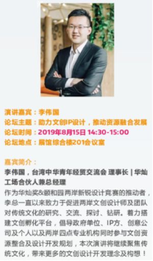 作为华灿奖&颐和园两岸新锐设计竞赛的推动者,台湾中华青年经贸交流会理事长李伟国先生将带来主题为“助力文创IP设计,推动资源融合发展”的演讲,本次演讲将继续聚焦传统文化,为大家带来更多的文创设计开发理念及构想!