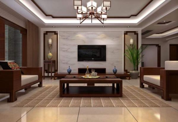 ①中式传统文化离不开清晰明朗的线条,从吊顶到茶几等家具,再到墙面,空间颜色以棕色为主,不奢华,有不失品位,给人沉稳大气的感觉。
