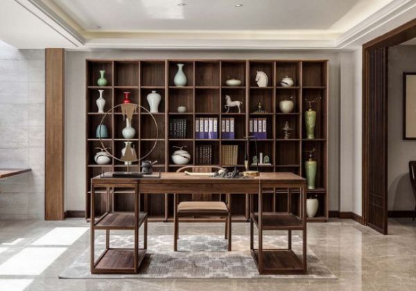 ①体现中国文化的物品:陶瓷,光润自然古朴简洁,结合新中式风格的展示柜更彰显优雅风韵。