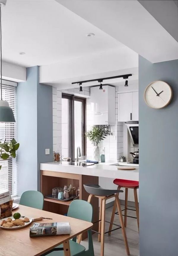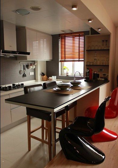 在小户型的厨房中设一个吧台来代替餐桌,已是很常见,当然这也是比较实用的设计。不过,要用吧台来代替餐桌的话,那记得安上合适的吊灯和灯光哦。