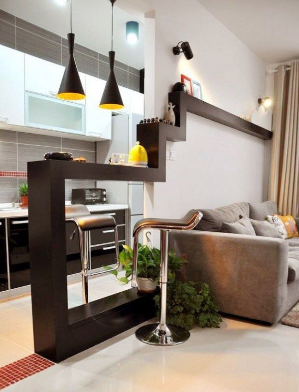 尤其是小户型,真正的实体隔断会使原来就很狭窄的空间变得更加拥挤,所以,吧台这种隔而不断的造型,提升整体感很强,对分隔区域也是很明显。
