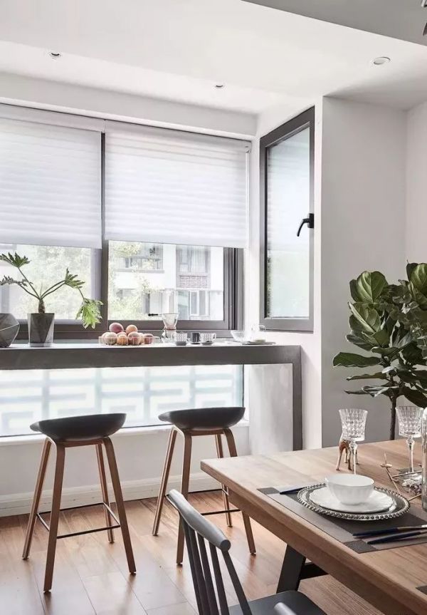 将吧台设计在墙边或窗边,也是一种很时尚的设计。只需搭一块搁板,你就有了一个小吧台。闲暇时间坐在这儿小饮一盅,吃个早餐,看看窗外景色,这样的吧台设计岂不让你享受!
