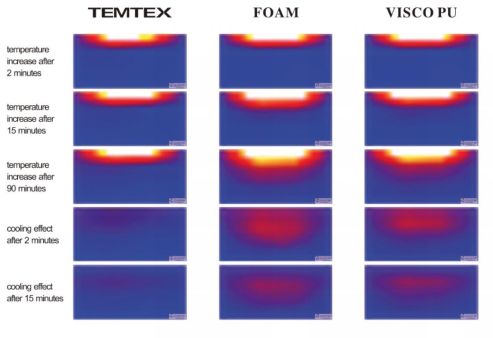 根据比利时鲁汶大学的测试报告,TEMTEX钛蓝材质与泡绵和PU等传统材质相比,优势极为明显: