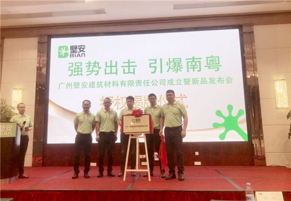 随后,陈明先生代表壁安品牌与广州壁安建筑材料有限责任公司总经理陈辉先生为广州壁安公司成立现场揭牌并授权,民建广州公司总经理陈咏铨先生、连云港壁安公司董事长汪奇先生、合肥壁安公司董事长谢齐和先生作为特邀嘉宾作共同见证。