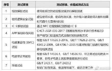 这次的测试内容主要是:指纹解锁试验、密码逻辑安全试验、IC卡解锁试验、APP解锁存在网险、EMC电磁兼容性、电路非正常试验、环境试验,测试标准及方法如下。