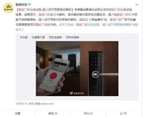 8月11日,北京、天津、河北三省消费者协会联合发布智能门锁比较试验结果。试验结果显示,智能门锁IC卡解锁、指纹解锁等方面都存在较多问题,超过六成的智能门锁IC卡钥匙可以被破解复制,超过八成可用制作的假指纹解锁。消息一出,各界哗然!