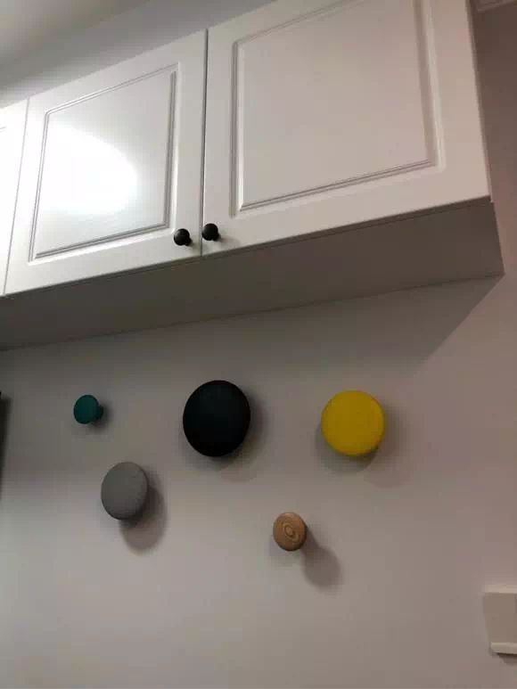 家中不少别致的小软装,都是自己看案例学着布置的,墙上的小圆形其实是挂钩哈,挂衣服包包都很方便,主要颜值还高!