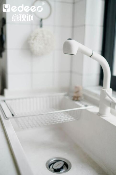 除了黑色,意狄讴的白色的石英石水槽设计也是独具一格。纯净的白也会让人心情变得愉悦轻松。而且,在靠窗的台面上安装的白色石英石水槽,更能体现出厨房的通透感。使整个厨房氛围变得妙不可言。