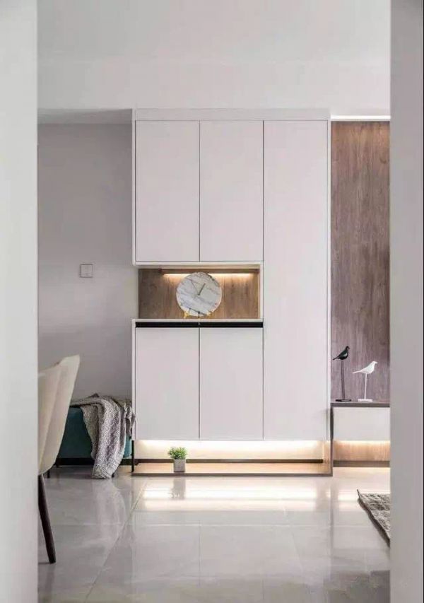 入户定制到顶鞋柜,避免空间浪费增加收纳。鞋柜设计上也考虑很周到,中间空余部分和底部都装有照明灯。白色极简无拉手柜门,实用又高级。
