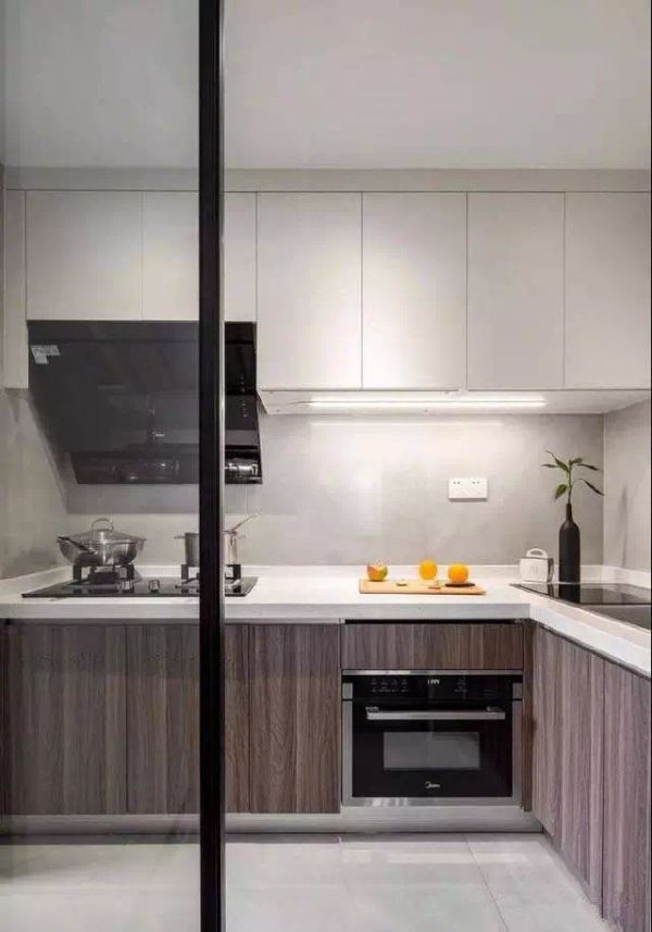 L型厨房设计,定制橱柜和吊柜,深浅色搭配提升空间层次感。黑色全框玻璃门,增加了通透感,避免空间过于封闭。