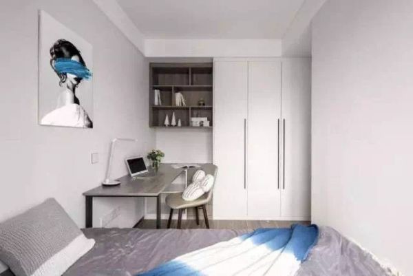 次卧兼书房,衣柜与书桌吊柜完美衔接,简洁实用的设计,让原本紧凑的空间不那么拥挤。