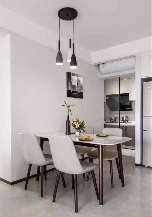 餐厅实用为主,摒弃繁杂的装饰品,简单漂亮。冰箱以嵌入的方式摆放在角落,避免影响其他空间,空调内机半隐藏式,整体美观协调。