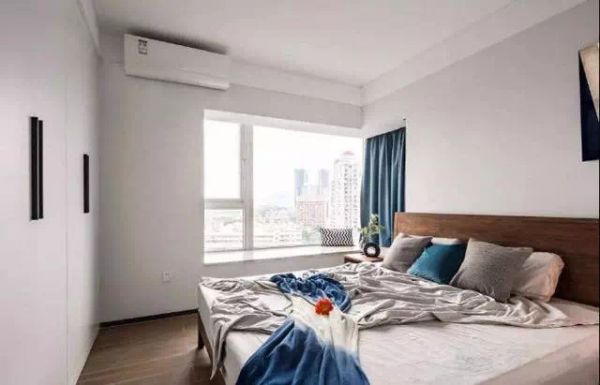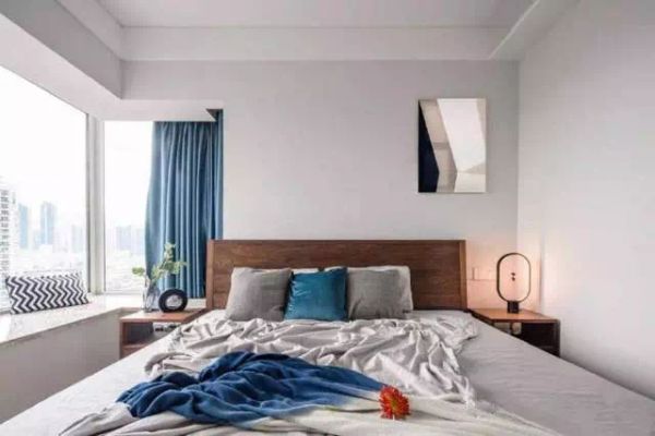 主卧简洁明亮,转角飘窗极大的提升了卧室采光,窗帘设计避免过长,视觉效果非常好。床尾设计衣柜,一整排收纳空间够用了。