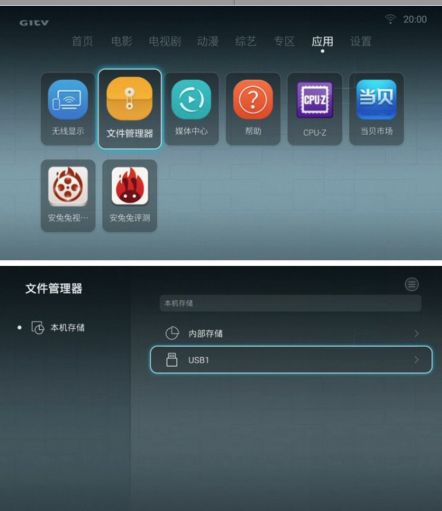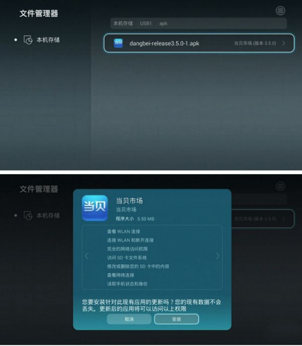 第一种方法:U盘安装在电脑上下载好当贝市场(www.dangbei.com)的apk并存入U盘,然后将u盘插到荣耀智慧屏的usb接口处。系统会自动跳出外接设备,也可以找到系统自带的【文件管理器】。找到下载好的当贝市场,点击进行安装即可。