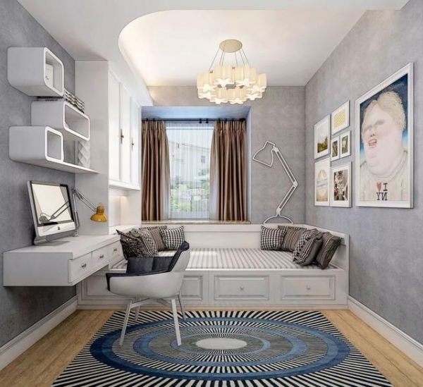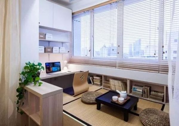 阳台虽小但照样能做一整排的榻榻米,甚至还能摆放一个转角书桌,强大!