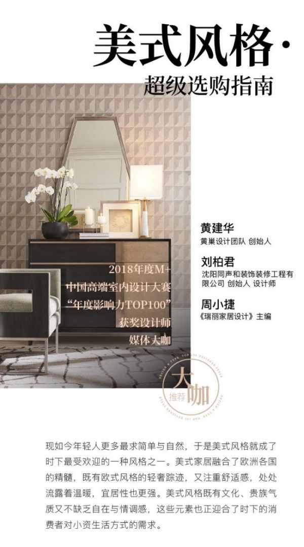 《2019超级选购指南-全屋风格篇》从懂你开始,其以当下最受消费者青睐的“美式、现代、新中式”3种风格划分品牌,甄选出7大超级品牌A.R.T.、Thomasville & Co.、柏森、华日、城市之窗、北欧E家、曲美,并按照空间套系分类,让消费者可以从自身的喜好出发,与优质品牌相遇相知。
